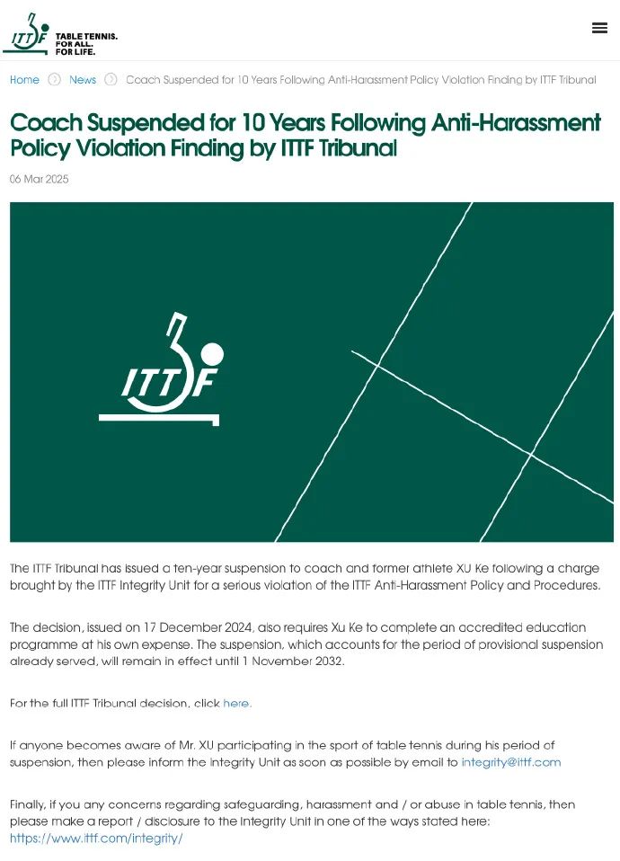 此前,国际乒乓球联合会诚信部门控告教练兼前选手徐克严重违反国际乒乓球联合会反骚扰政策和流程,国际乒乓球联合会法院对此处以停赛十年处罚。