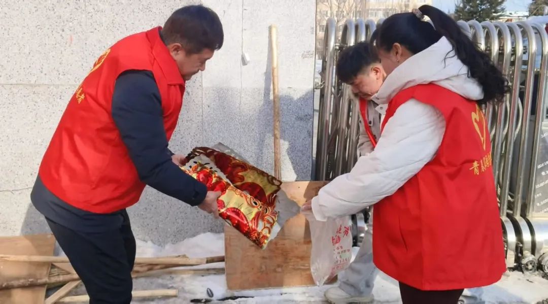 活动期间,志愿者们手持铲子、扫帚等工具,不畏严寒,共同清扫积雪。同时,志愿者们手持塑料袋,认真清理绿化带、人行道上的碎纸、塑料袋等垃圾,用实际行动践行雷锋精神。