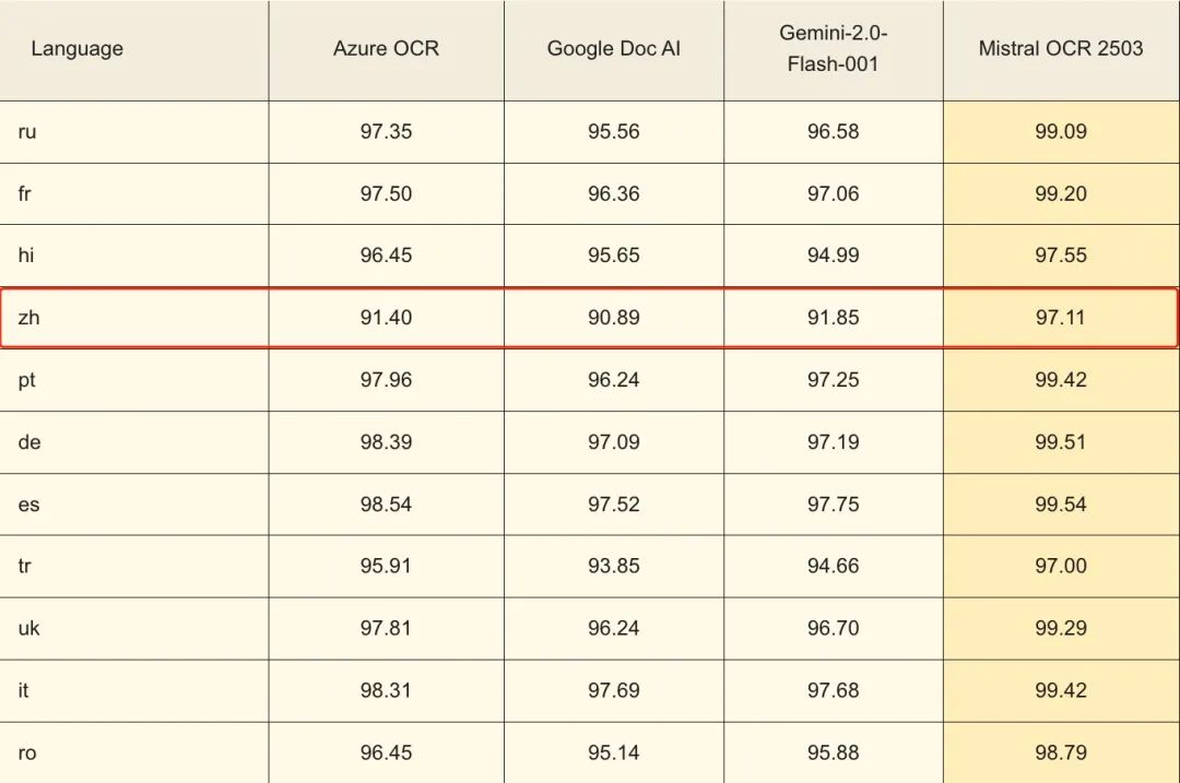 归根结底,在他们的评分表中, Mistral OCR 不但有很多语言支持,而且每个分数都接近 99%。。。