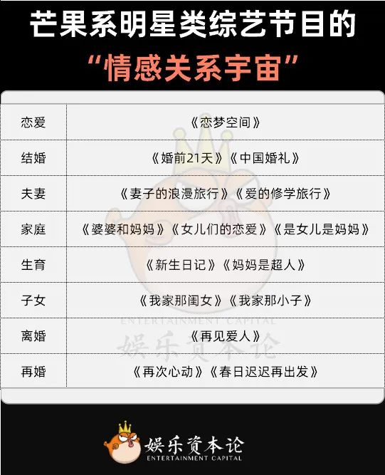 那就是为什么中国综艺节目,尤其是综艺节目带芒果系正在构建一个复杂的“情感关系宇宙”。之前有人研究过,芒果系出品了15档明星情感综艺节目,包括从恋爱到离婚甚至再婚,包括婆媳、母女、亲子等很多容易引起社会争议的话题。