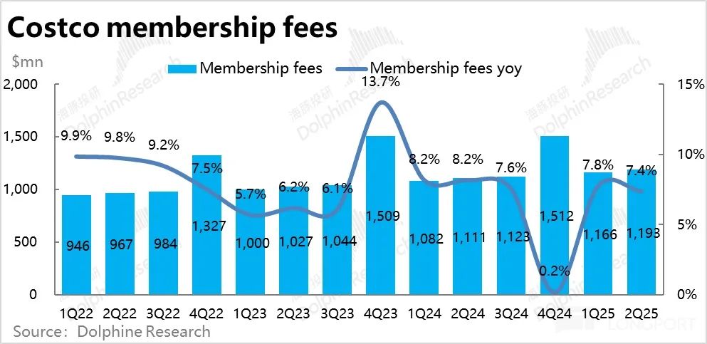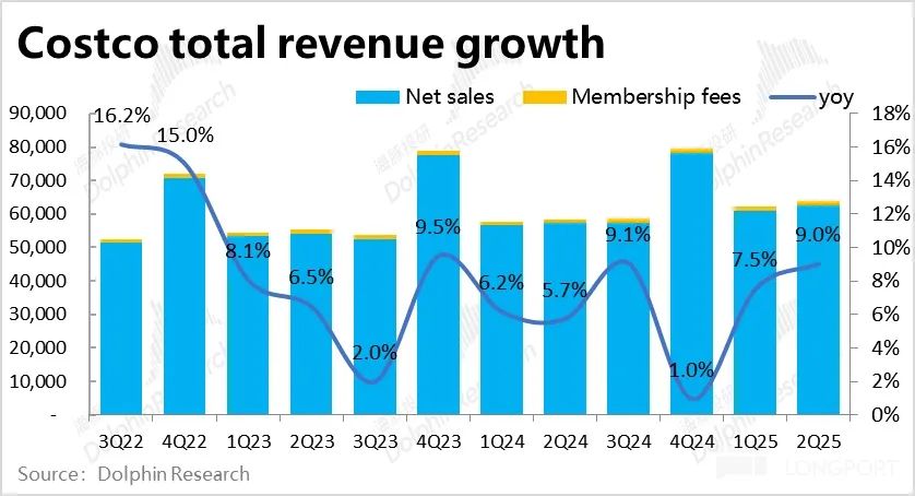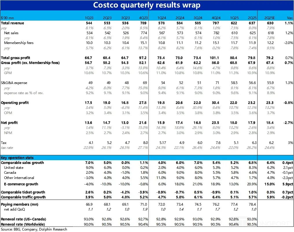 财务指标方面,本季 Costco 实现总收入 637 亿,同比增长 9%,虽然会费收入略低预期,但毕竟营收方面的比例很小,而占大部分的产品增长强劲,所以总营收增长仍然超出预期。