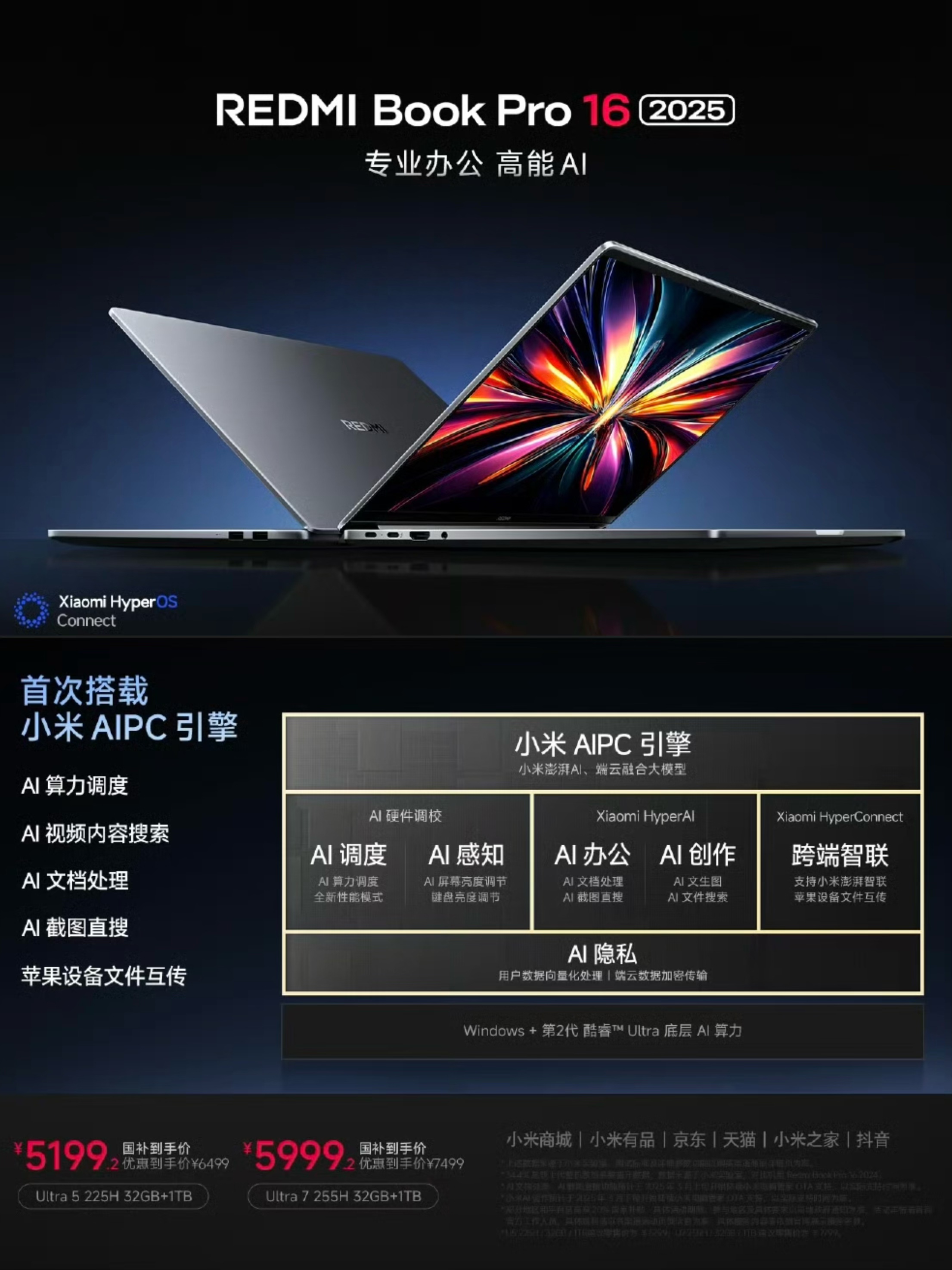 小米首款AIAI同日发布。 PC新品 REDMI Book Pro 2025年,虽然显得低调,但也值得注意。