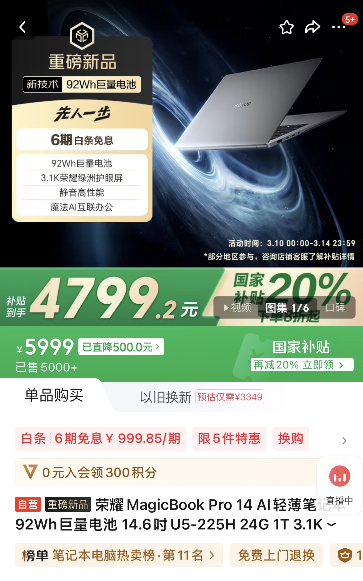 MagicBook荣誉 Pro 14国补后价格从4799元起,重视从硬件校准到人机交互,再到跨端生态的全面性。 AI 重构,尤其是 HONOR Turbo X 技术和 YOYO 助手 2.0 深度应用。YOYO助手 接入大模型后,端侧支持智能搜索、阅读、阅读、AI 创作,一句话交互等功能,如PPT。