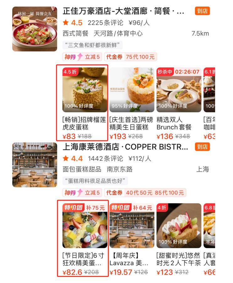 据分享,在一些团购平台上,上海康莱德酒店原价为208元“6寸生日蛋糕”,团购价格为83元;广州郑佳万豪酒店团购价格为188元“6寸榴莲蛋糕”,原价为188元;广州郑佳万豪酒店每月推出一款“288元2磅”的优惠蛋糕,相当于打五折...