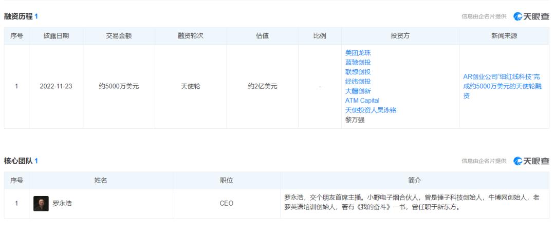 之后,罗永浩开始到处扩大融资规模。“天眼查”显示,2022年11月,细红线科技宣布完成天使轮融资约5000万美元,投资后估值达到2亿美元。本轮融资由美团龙珠领先,蓝驰风险投资、联想风险投资、经纬风险投资、DJI创新等知名投资机构,以及黎万强、吴泳铭等科技人士纷纷投资。