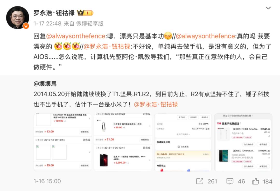 在分享网友的消息时,罗永浩评论道:“单纯的做手机是没有意义的,但是对于AIOS来说...那些真正关心软件的人往往会选择自己做硬件。。“这句话一出来,立刻引起了很多网友的猜测和讨论。有网友兴奋地说:“真的吗?我想要一部漂亮的手机!”罗永浩肯定地回答:“嗯,漂亮只是基本功。”