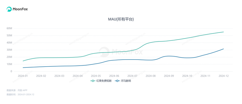 月狐iAPP数据显示,在2024年底,字节旗下的短剧APP“红果短剧”的MAU较年初增加2.8倍,点众科技旗下的短剧APP“河马剧场”的MAU较年初增加4.9倍。