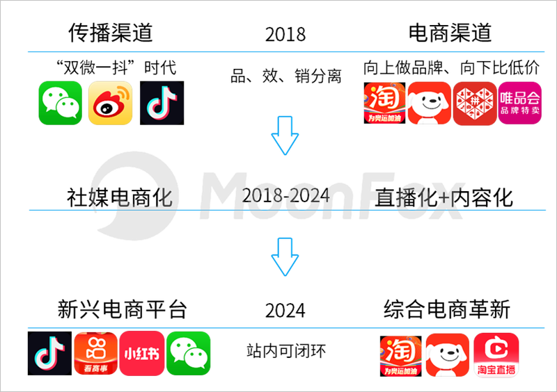2018-2020年,KOL及各类自媒体内容井喷式爆发,广告主预算向互联网尤其社媒渠道大幅倾斜,头部KOL成为品牌口碑、销售转化的重要保障。抖音2021年开启货架电商的建设,快手、小红书、B站、微信视频号等多平台相继加入,以直播电商业务为抓手,引入商家、建设货架、形成商城——2024年行业新格局形成,新老电商平台不仅实现跨生态流量的打通,内部也能实现内容和电商闭环。