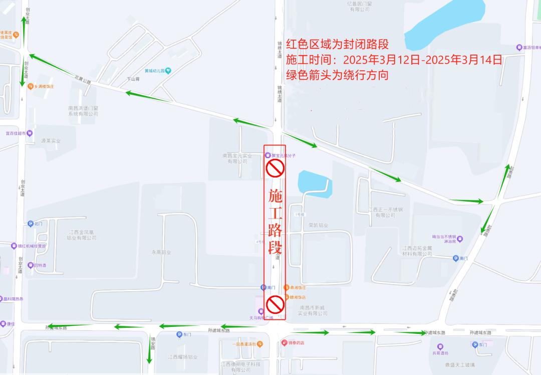 由于安义县高新园区城市给排水建设项目管网建设,锦绣大道需要将新建管道跨路连接到排水主管。2025年3月12日至2025年3月14日,锦绣大道与孙滤城东路十字路口至锦绣大道与北黄公路交叉路口将全封闭施工。