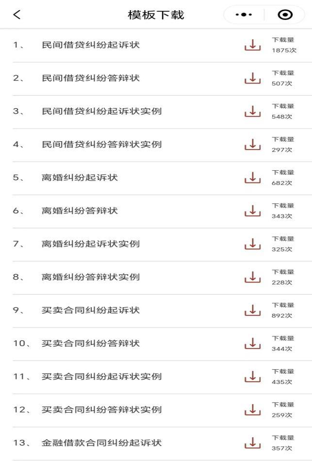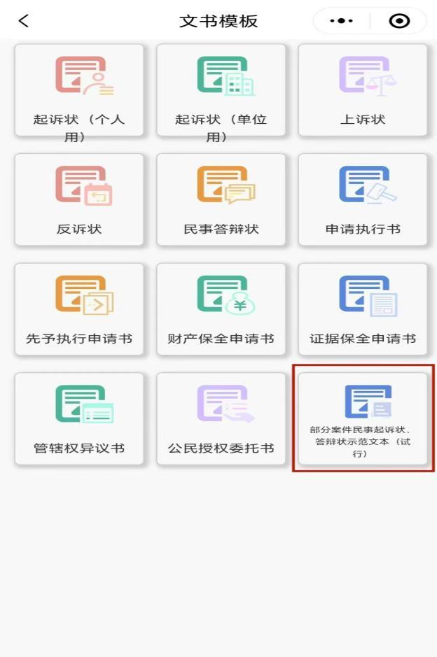 小程序搜索“人民法院在线服务”→单击“辅助工具”→选择“文书模板”→选择“部分案件民事起诉状、答辩状示范文本(实施)”→根据具体类型的纠纷选择相应的模板,立即下载并填写。