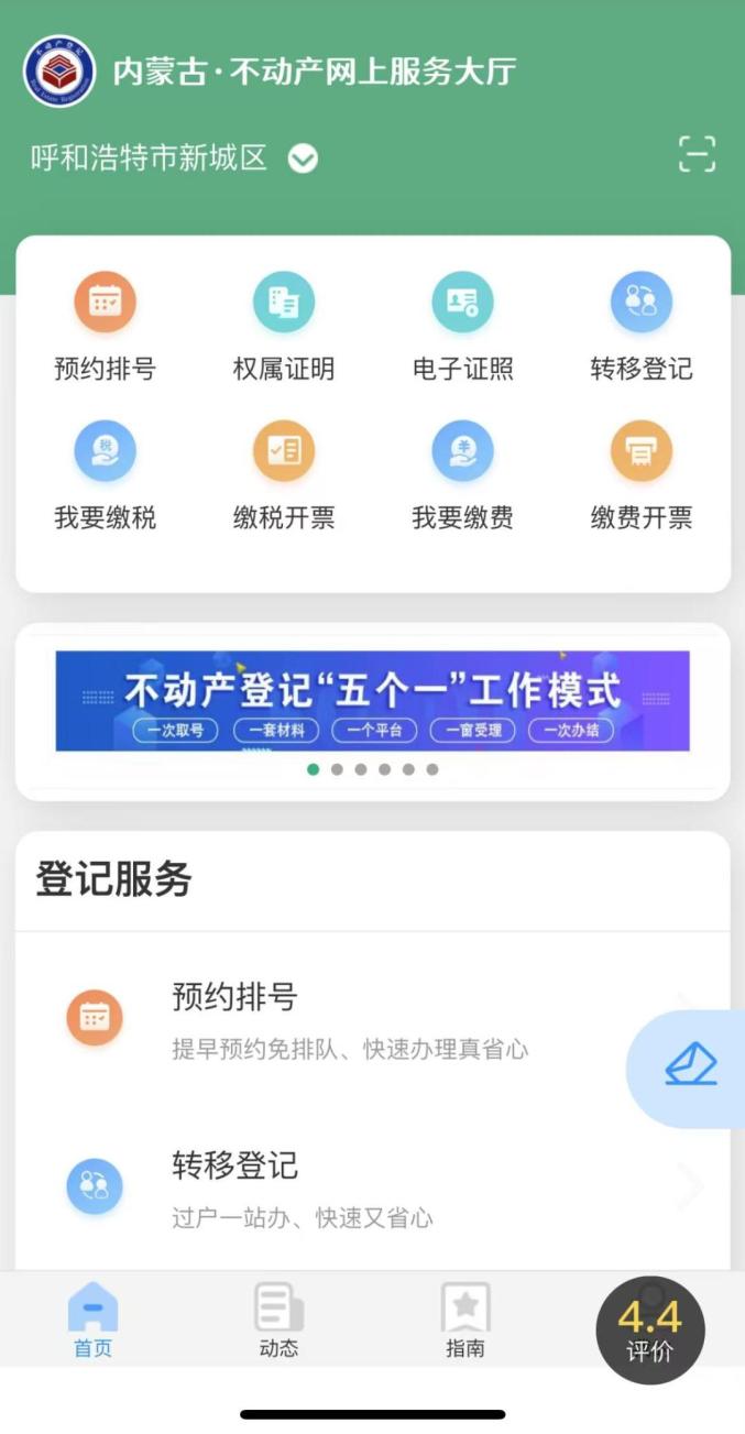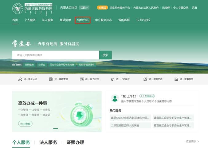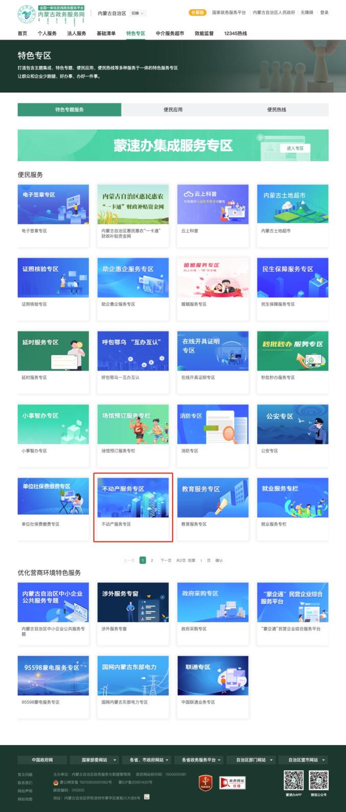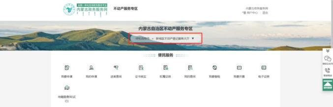 在【首页】点击“特色区”,点击“内蒙古政务服务网”,点击“房地产服务区”,选择合适的服务大厅后办理。