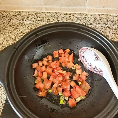 2、加热锅里的热油,加入葱花炒香,再加入番茄,炒至番茄出汁,再加入酱油、油耗和盐。