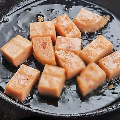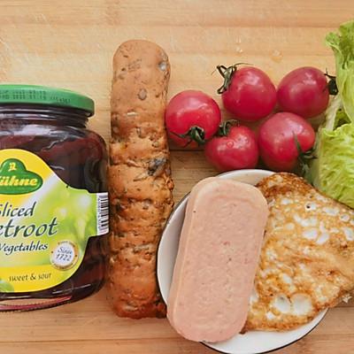 5、放入冠利红菜头,放入 2 勺酱和少许冠利红菜头片的汤,搅拌均匀即可享用。酸甜的冠利红菜头片,坚果欧式包包的香味,浓浓的煎蛋,咸咸的午餐肉和清爽的蔬菜,各种口味交织在一起,层次丰富。