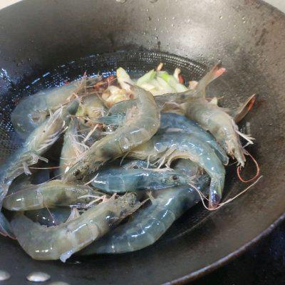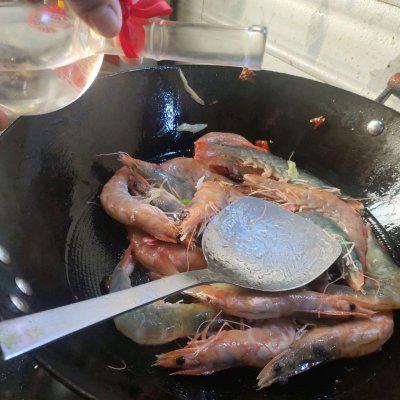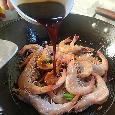 10、把所有的新鲜虾都炒成红色,然后把刚准备好的汁倒进去。如果水太少,可以加一点清水。然后盖上盖子炖。 2 分钟。