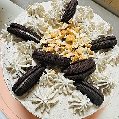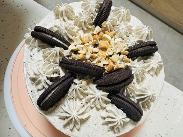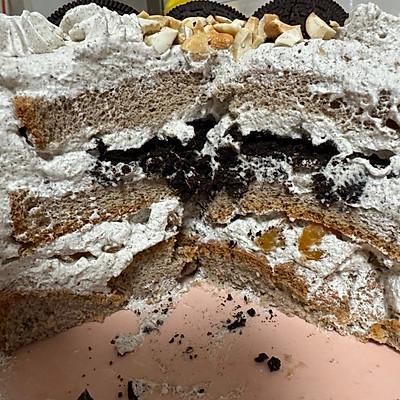 3、1. 淡奶油 600 克,加 20 克糖、2.5 克海盐消磨至出现纹理,倒入 25 克利奥碎片继续消磨到便硬备用。 2. 首先在底层抹一点奶油,放上第一层戚风,把奶油装在装满奶油的装袋里,在外面再挤一圈奶油。