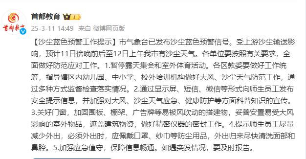 @首都教育今天下午 公布了“风沙蓝色预警工作提示”,明确各单位要按照有关要求,全面做好防范工作。