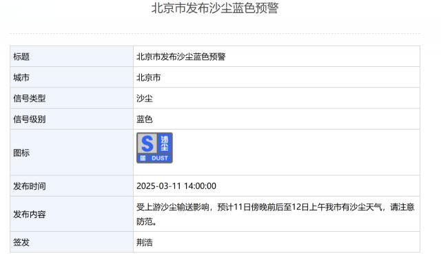 北京市气象台 3 月 11 日 14 时发布蓝色风沙预警信号:受上游风沙运输的影响,估计11 晚上前后到来 12 早晨当地有沙尘天气。,请注意预防。这里也是北京今年的第一个风沙预警。