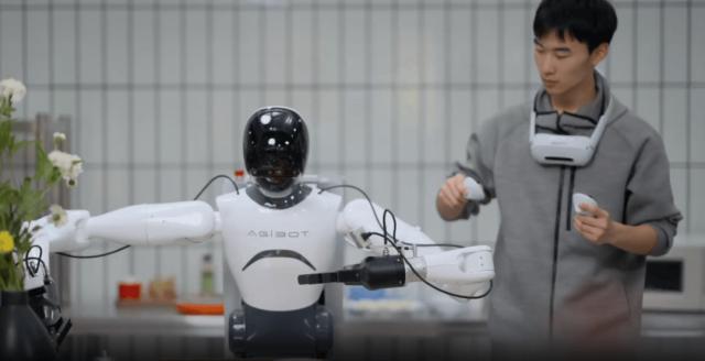 AgiBot World 所有的数据都来自智源的数据采集工厂,里面有很多模拟真实场景。数据采集者的日常任务是教机器人如何执行某些任务。