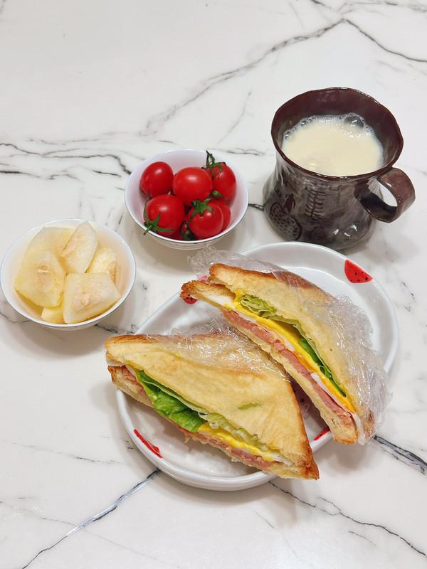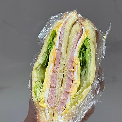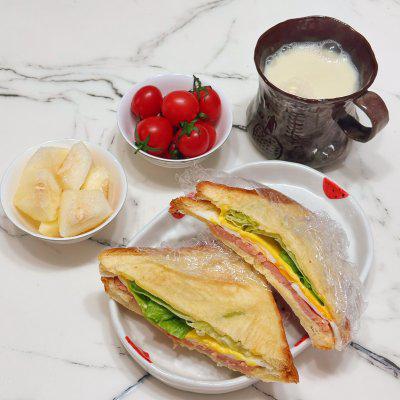 4、吐司➕鸡蛋➕奶酪片➕午餐肉➕生菜➕吐司,可以用三明治机压,也可以不压。