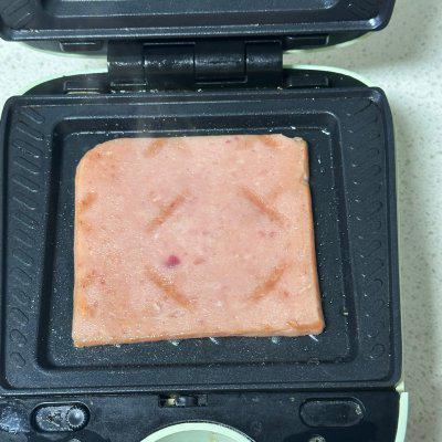 2、切一块大片午餐肉,加热。