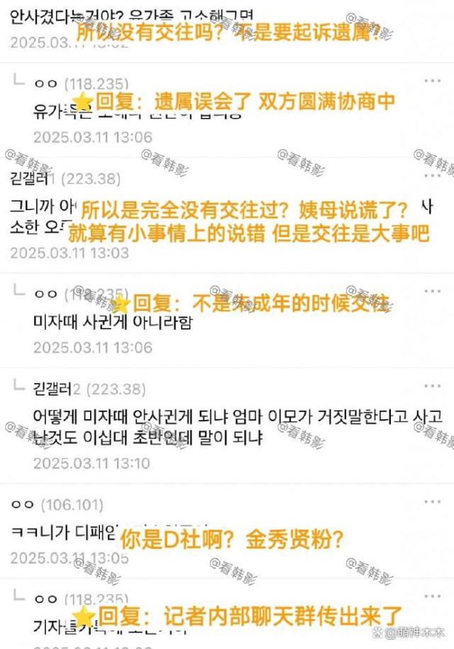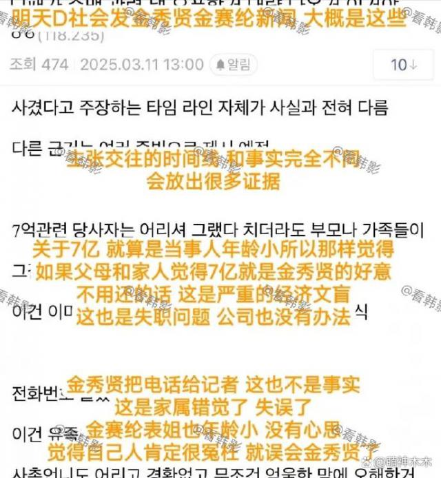 根据截图,澄清分为三种方式,一种是否定爱上未成年金赛纶的时间线,另一种是狡辩。 7 十亿债务归属,训斥金赛纶和遗属是经济法的盲人,其中三个把所有的问题都推给金赛纶的家人,声称他们误解了。从这些公关方面来看,金秀贤确实不把金赛纶的死当回事,也不在乎他们。 6 年旧情。