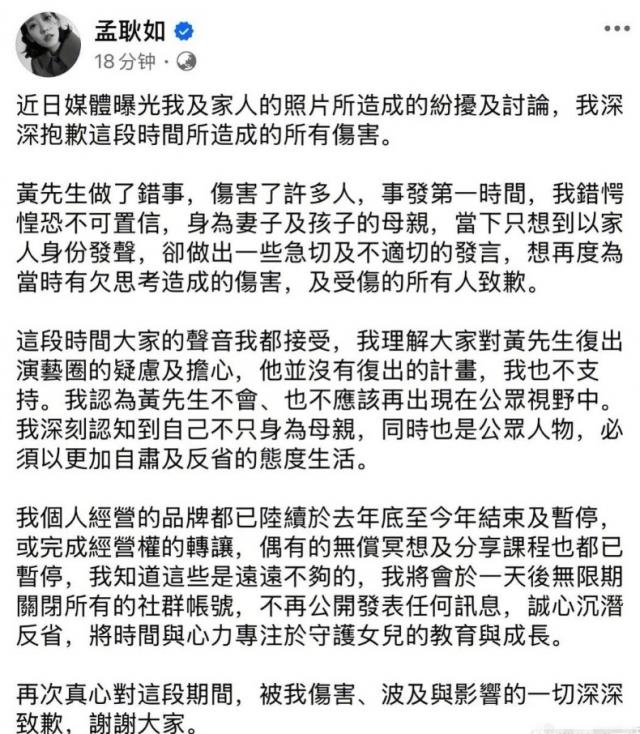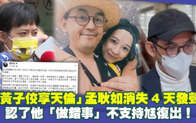 孟耿如在不得已的情况下,通过社交平台道歉,谈到了丈夫黄子佼事件后自己的心路历程。
