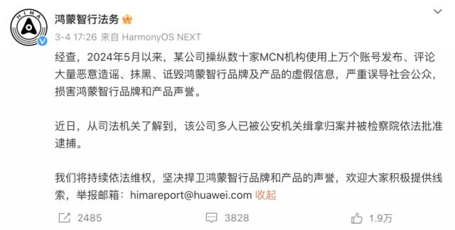 根据鸿蒙智行发言人的说法,开放线索和证据征选后的第二天,就收到了超越。 1 万条私聊。3 月 4 日本,鸿蒙智行法务公司认证为“鸿蒙智行法务官方微博”,发布了第一条微博,公布了一起案件的进展: