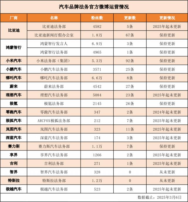 经过统计,发现电厂已经有了 18 家用汽车品牌开通了法务部官方微博,包括极越等基础退出市场的品牌,哪吒等暂时陷入经营困难的品牌;还有传统汽车企业转型的新品牌,如岚图汽车、极狐汽车、深蓝汽车等;甚至还有没有社交媒体的零跑车高管,却开通了法务部官方微博品牌。