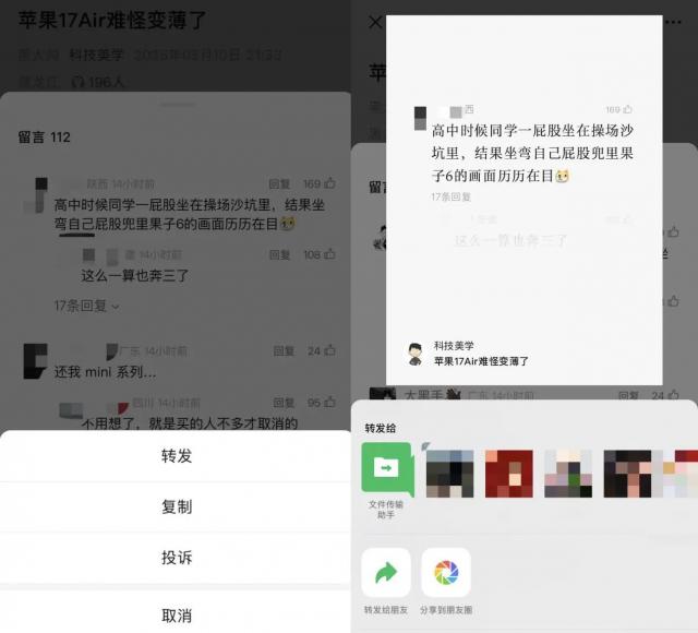 另一个新功能是点击任何微信官方账号文章,长按一条消息,即可“分享”当前消息,支持转发给微信朋友、群聊、朋友圈。
