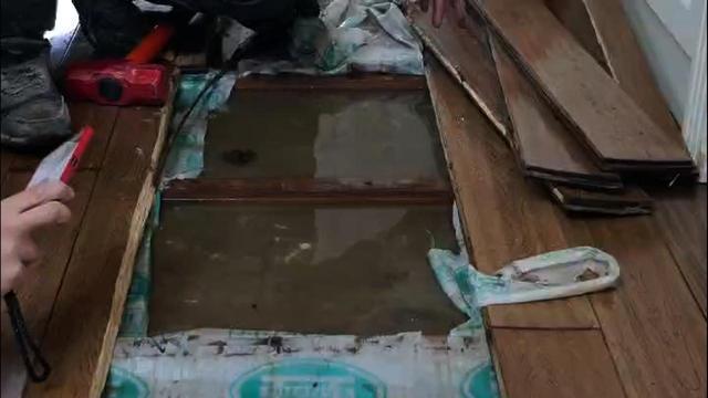 事发后,参加维修的装修公司帮宋女士家撬地板抽水。工人们只是撬开一块地板,撕开里面的薄膜。里面的污水太深了,工人们可以喊“我可以养鱼”。宋女士甚至自嘲,“买几条鱼放进去。”