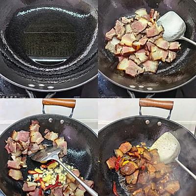 2、把热锅里的凉油放在腊肉里翻炒。我的腊肉比较瘦,所以放更多的油。如果你有更多的肥料,你可以不放油。炒一下就会出油。将腊肉翻炒一分钟左右,放入生姜中。 大蒜和辣椒翻炒出香味和腊肉一起翻炒几秒钟,放入生抽翻炒。