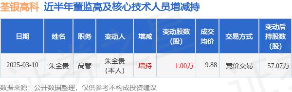 荃银高新:3月10日,朱全贵高管增持股份共计1万股。