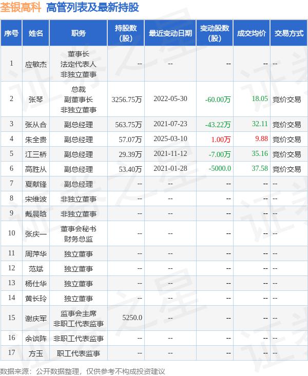 近半年来,荃银高新董监高和核心技术人员调整持有以下详细信息:
