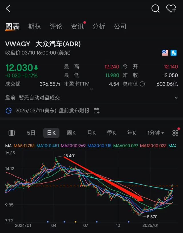 因为业绩的压力,大众的股价也在下跌,从最高点开始。 15.401 欧跌至只剩 8.570 欧洲,几乎腰斩。