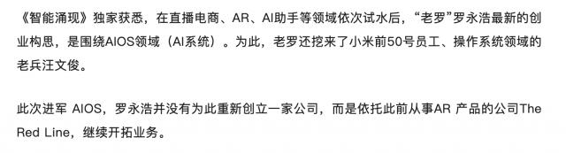 根据媒体报道,罗永浩最新的创业理念是 AIOS 领域(AI 所以他还挖出了小米之前的系统) 50 员工和操作系统领域的老兵汪文俊。此外,罗永浩并没有再创立一家公司,而是依靠他以前从事的工作。 AR 公司继续开拓产品业务。