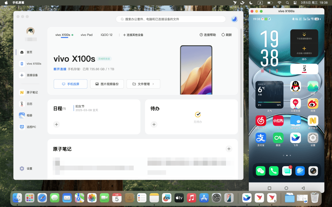 在 Mac 上下载好 “ vivo 办公套件 ” 后,你会发现 OPPO 所支持的拖拽互传文件、便签与待办事项实时同步、远程用手机操控 Mac;还有小米支持的手机投屏到电脑用 Mac 控制,这些功能可以说一个都不落。