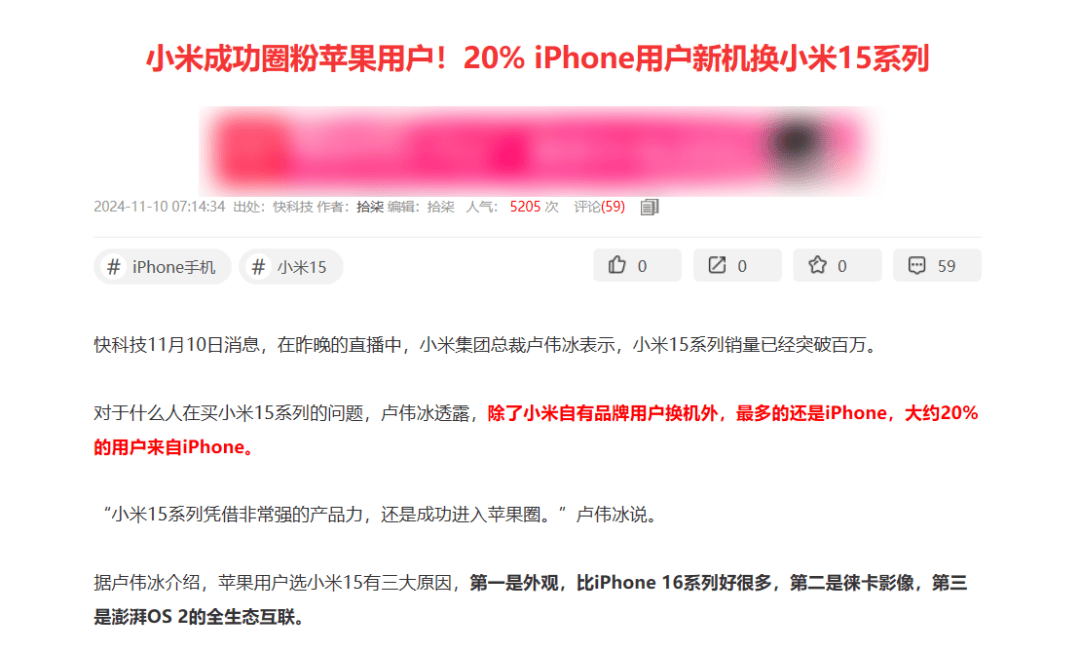 去年年末小米 15 系列发布后仅用一个月,销量就突破了百万,小米总裁卢伟冰在直播中透露 —— 除了小米自有品牌用户换机外,最多的还是 iPhone,大约有 20% 用户来自 iPhone,相当于从苹果那边虎口夺食。