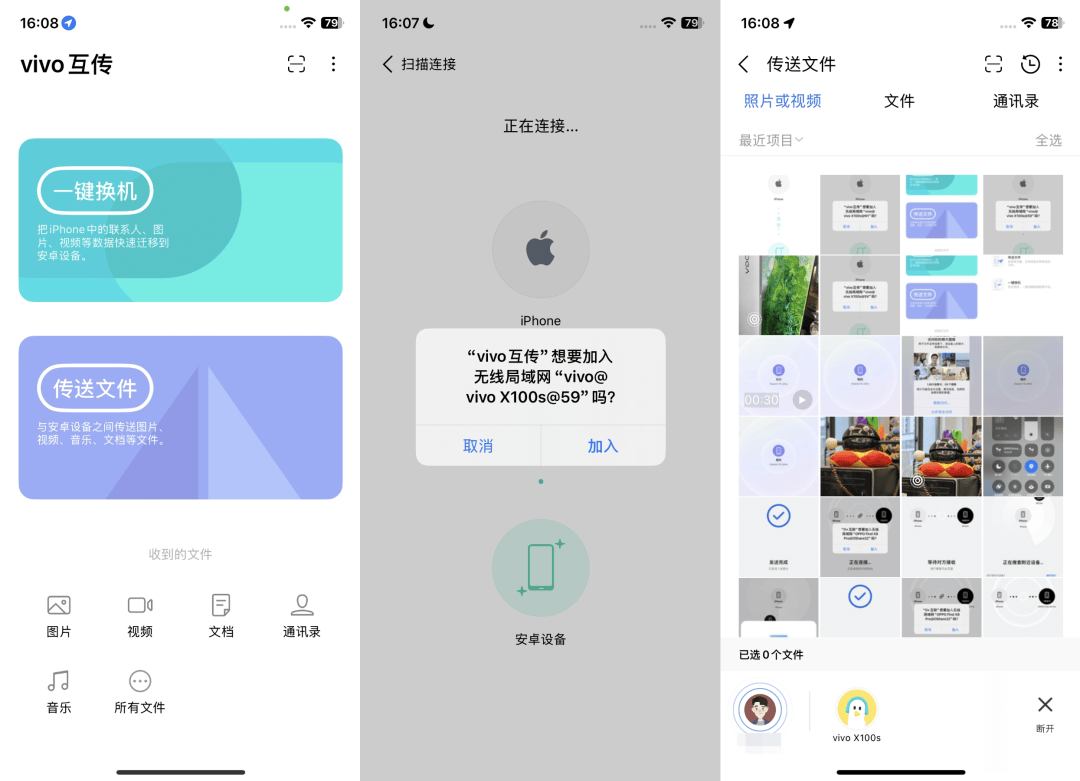 而 vivo 则是通过 “ 互传 ” APP,它跟 “ O+ 互联 ” 一样,使用前不需要咱们登录 vivo 账号,但跨设备传文件的时候,还是得在 APP 里扫码让 iPhone 连上 vivo 手机的热点。