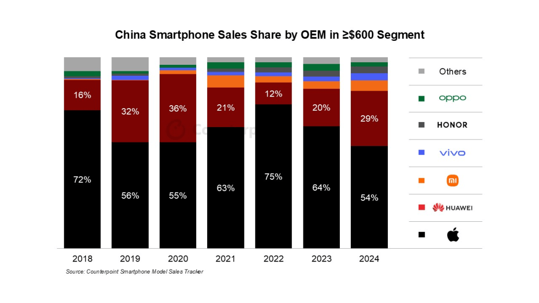 根据 Counterpoint 给到的数据显示,2024 年中国 600 美元以上高端机市场里,光是苹果和华为加起来就吃掉了 83% 的蛋糕,其中苹果直接就占据了 54% 的份额,可以说一直主导着中国高端智能手机市场。