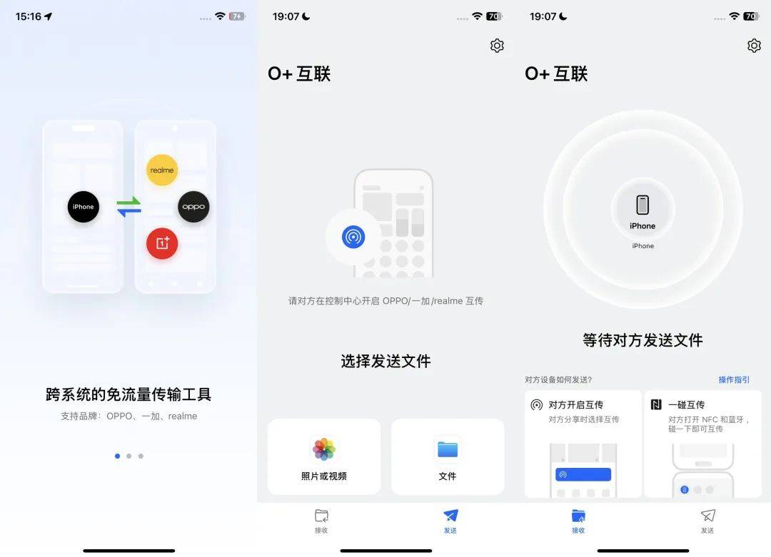 比如现在我们只需要在苹果设备上装一个 “ O+ 互联 ”,就能实现 OPPO 手机跟苹果设备的互传。