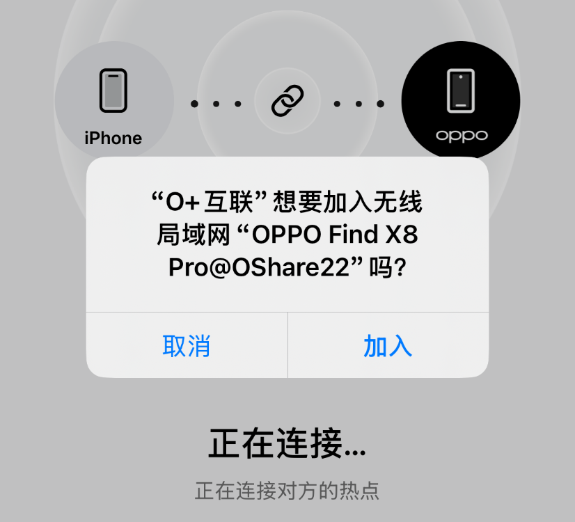 在 OPPO 手机相册里选好照片点击分享后,直接拿它靠近 iPhone,iPhone 会自动跳出小卡片,这时候只需要点 “ 打开 ” 就能自动跳转到 “ O+ 互联 ” 进行配对,相比手动打开 APP 再配对显然要省事不少。