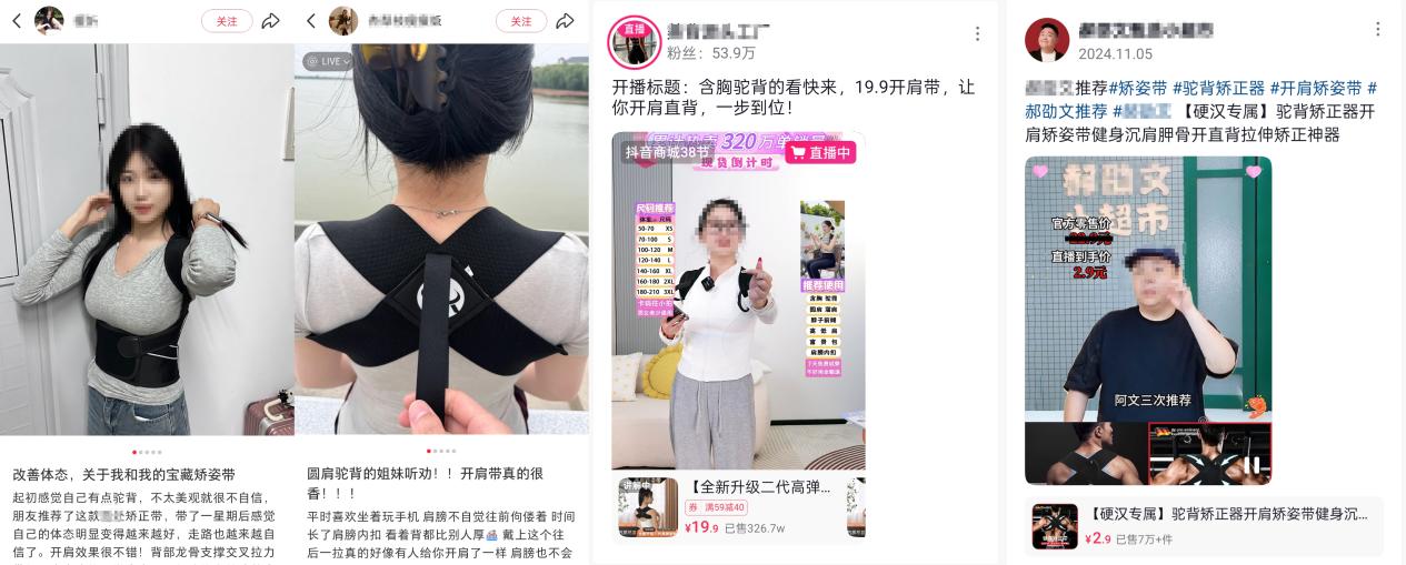 销量方面,根据新知识研究所的粗略统计,小红书、抖音、淘宝店的总销量已经超过100万。如果统计全网,200万的销量肯定是有的。价格方面,最便宜的矫形带低至五六元,而走量较高的矫形带大概可以达到两三百元的价格。