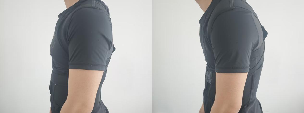 但是佩戴起来真的很简单,就像广告里显示的那样,把两边的肘部套在腋下,然后往上滑下背部就可以了,但是佩戴一段时间后,我们并不认为它有宣传中那么强大的功能。