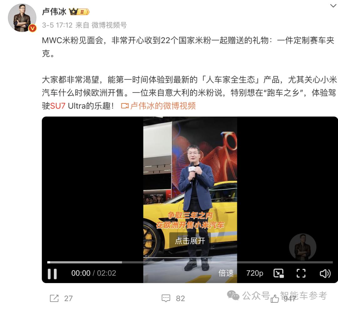最近,在巴塞罗那MWC(世界移动通信大会)上,小米集团合作伙伴、总裁卢伟冰远渡海洋,为小米SU7 欧洲首秀Ultra站台。