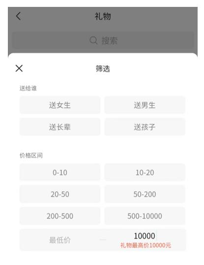 单击礼品页面右上方的“选择”按钮, "送女孩/男孩/长辈/孩子" 选择四种情景标签,同步匹配 0-10元,10-20元,20-50元,50-200元,200-500元,500-1000元。 六档预定价格,或者自定义区间。不变的是,商品原价上限为1万元。当价格超过1万元时,系统会提醒“礼物最高价格为1万元”。