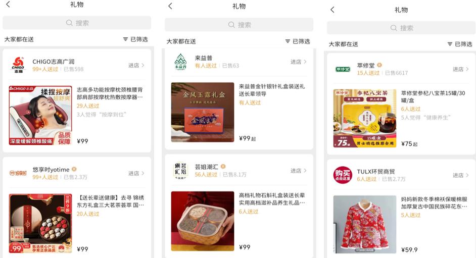 值得注意的是,筛选之后, 产品页面将结合「大家都在送」、送礼物的目标,价格区间的精确投放, 在商品标题中加入 “生日礼物”、“长辈礼盒”、“情侣” 等等,进一步放大社会属性。例如选择送长辈,商品多为按摩器、营养品、衣服、鞋子等适合中老年人的日用品。