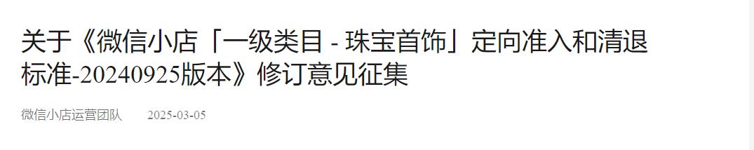 例如以前禁止的珠宝饰品,根据《微信小店「一级类目 - 珠宝饰品」修订意见的定向准入和退出标准(意见征集期为 3 月 5 日 - 11 日), 增加黄金工艺品,裸钻工艺品,铂金工艺品,K 金工艺品等三级类别, 并且要求商家必须在JD.COM / 天猫开设官方旗舰店,经营相应的二级品类商品,同时需要开业「运费险」和「假一赔三」只有服务保证才能上线。