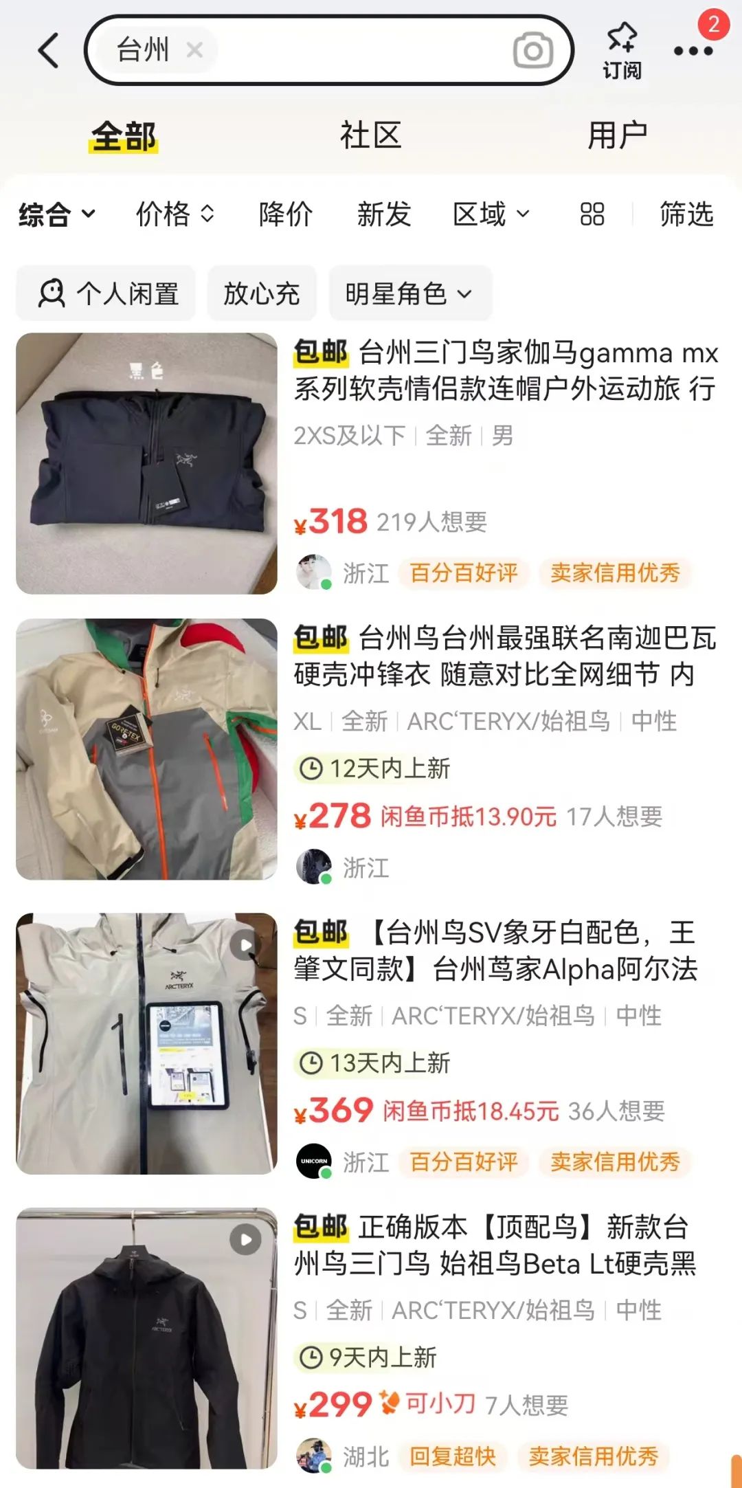 在淘宝、微店、闲鱼等交易平台上,以“台州鸟”为关键词搜索时,可以看到很多始祖鸟的高仿产品。比如始祖鸟蛇年限量夹克,售价8200元,“台州鸟”只需要300多元。