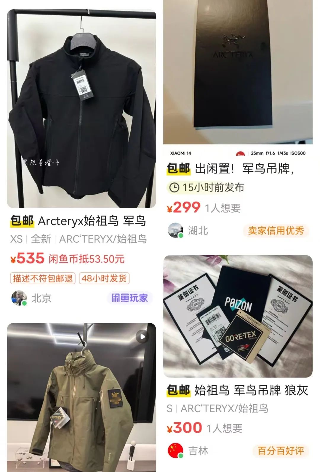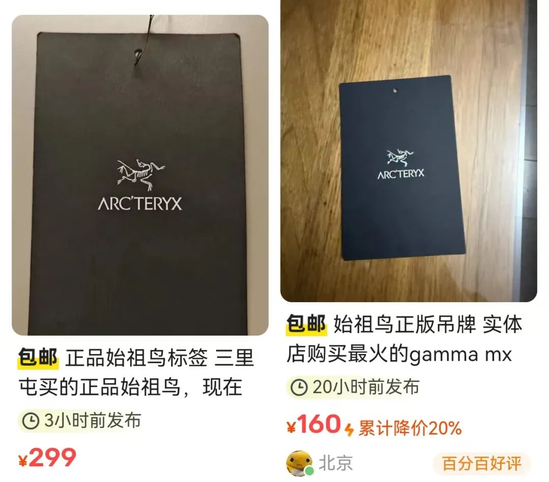 根据体育经济观察,闲鱼平台上发现有大量卖家在卖始祖鸟标签。这些标签价格从20元到288元不等,其中“军鸟标签”售价超过300元。
