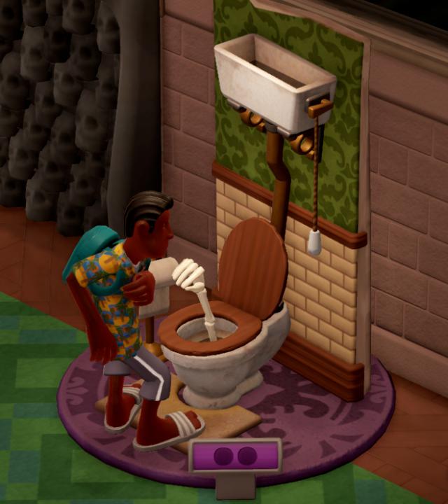 闹鬼的厕所, NPC 坐在上面互动时,会从马桶里伸出一只骷髅手,掏出一些东西。